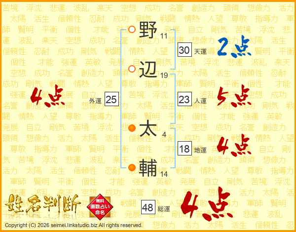 あなたの人生を表す1番重要な運勢です。生涯を通じて影響する総合運となり、主に50歳以降の晩年期に影響を及ぼします。苗字と名前の合計画数。