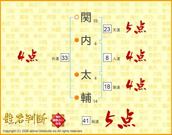 生活面を象徴する運勢です。外部から受ける影響力を表し、結婚運、家庭運や職場、環境への順応性を表します。総運から人運を引いた画数。姓や名が1文字の場合を除く。