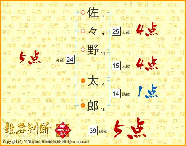 佐(7画)々(7画)野(11画) 太(4画)郎(10画)