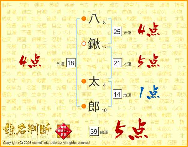 八鍬太郎さんの総運は39画の5点!