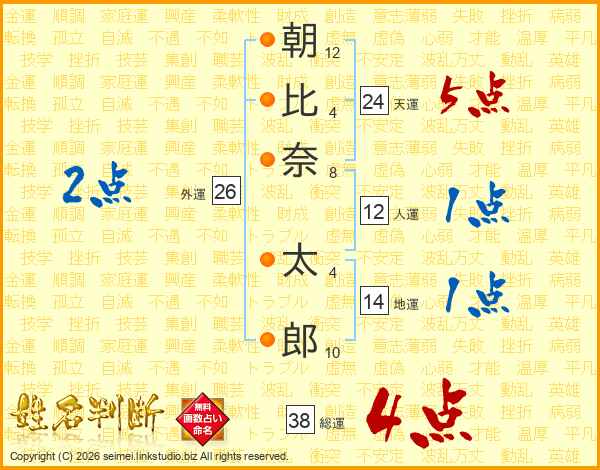 朝(12画)比(4画)奈(8画) 太(4画)郎(10画)