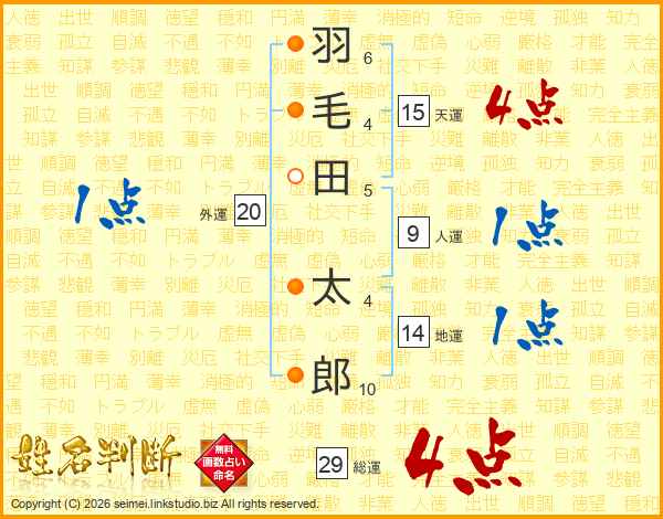 羽(6画)毛(4画)田(5画) 太(4画)郎(10画)