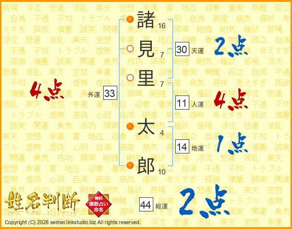 諸(16画)見(7画)里(7画) 太(4画)郎(10画)