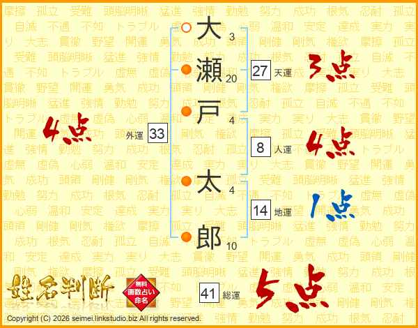 大(3画)瀬(20画)戸(4画) 太(4画)郎(10画)