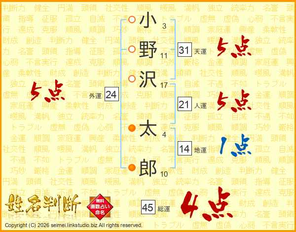 小(3画)野(11画)沢(17画) 太(4画)郎(10画)