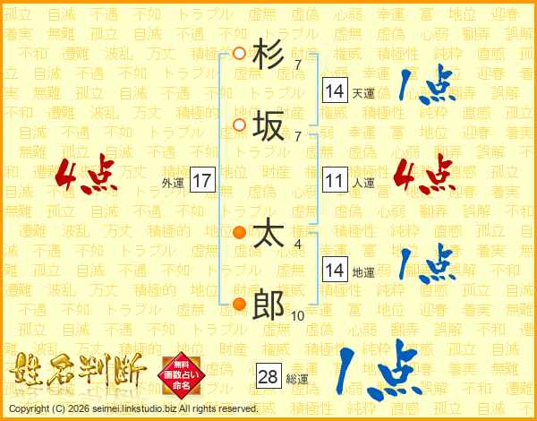 杉(7画)坂(7画) 太(4画)郎(10画)