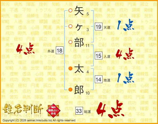 矢ヶ部太郎さんの総運は33画の4点!