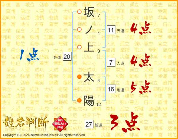 坂(7画)ノ(1画)上(3画) 太(4画)陽(12画)