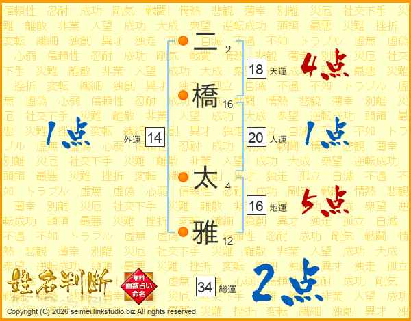 生活面を象徴する運勢です。外部から受ける影響力を表し、結婚運、家庭運や職場、環境への順応性を表します。総運から人運を引いた画数。姓や名が1文字の場合を除く。