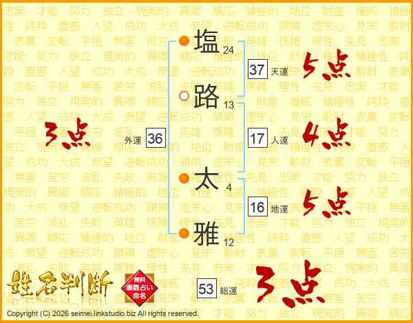 塩(24画)路(13画) 太(4画)雅(12画)