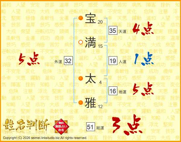 宝(20画)満(15画) 太(4画)雅(12画)