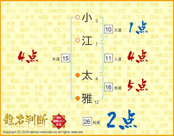 生活面を象徴する運勢です。外部から受ける影響力を表し、結婚運、家庭運や職場、環境への順応性を表します。総運から人運を引いた画数。姓や名が1文字の場合を除く。