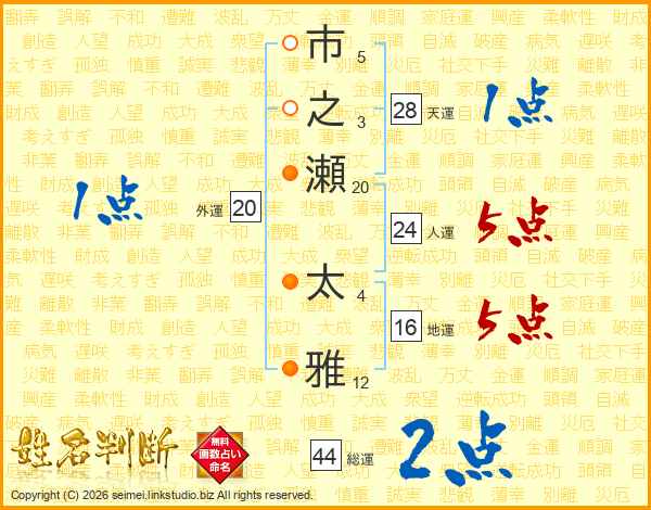 市(5画)之(3画)瀬(20画) 太(4画)雅(12画)