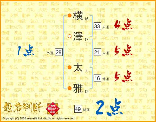 横(16画)澤(17画) 太(4画)雅(12画)