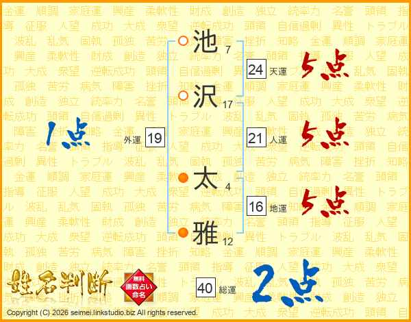 生活面を象徴する運勢です。外部から受ける影響力を表し、結婚運、家庭運や職場、環境への順応性を表します。総運から人運を引いた画数。姓や名が1文字の場合を除く。
