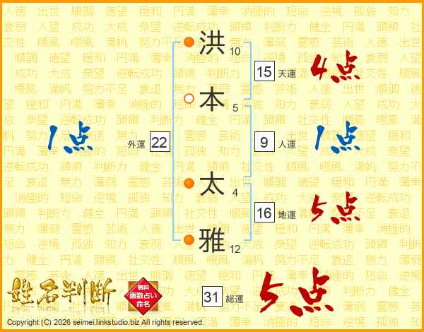 あなたの人生を表す1番重要な運勢です。生涯を通じて影響する総合運となり、主に50歳以降の晩年期に影響を及ぼします。苗字と名前の合計画数。