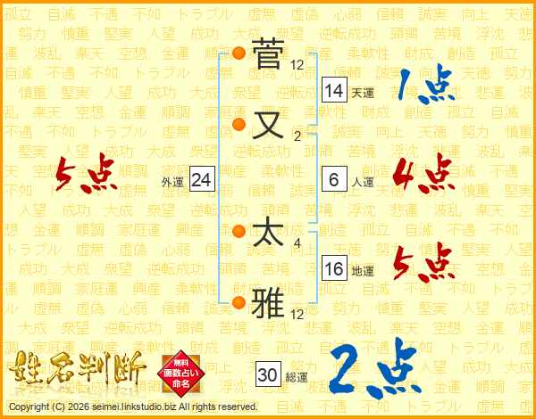あなたの人生を表す1番重要な運勢です。生涯を通じて影響する総合運となり、主に50歳以降の晩年期に影響を及ぼします。苗字と名前の合計画数。