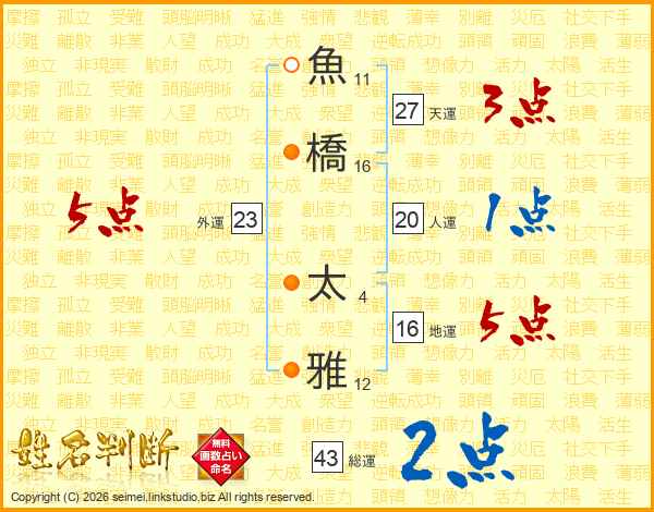 魚(11画)橋(16画) 太(4画)雅(12画)