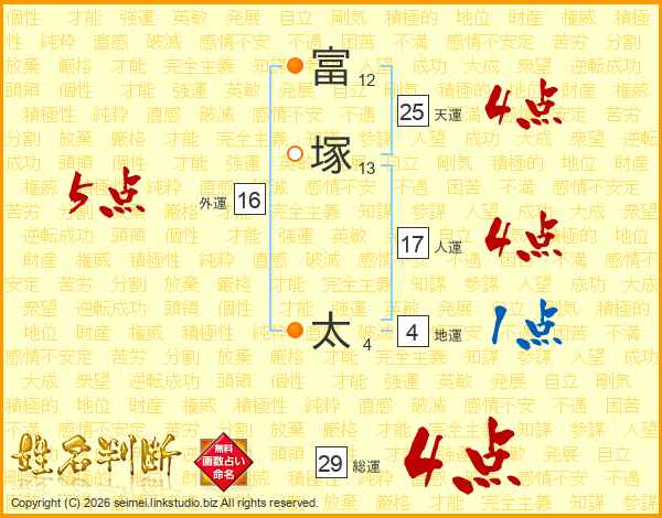 富(12画)塚(13画) 太(4画)