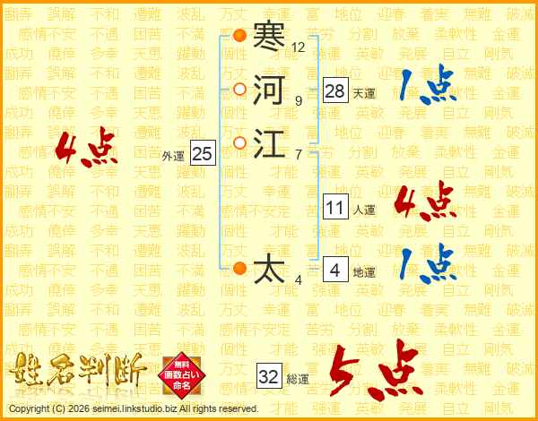 生活面を象徴する運勢です。外部から受ける影響力を表し、結婚運、家庭運や職場、環境への順応性を表します。総運から人運を引いた画数。姓や名が1文字の場合を除く。