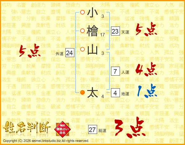生活面を象徴する運勢です。外部から受ける影響力を表し、結婚運、家庭運や職場、環境への順応性を表します。総運から人運を引いた画数。姓や名が1文字の場合を除く。