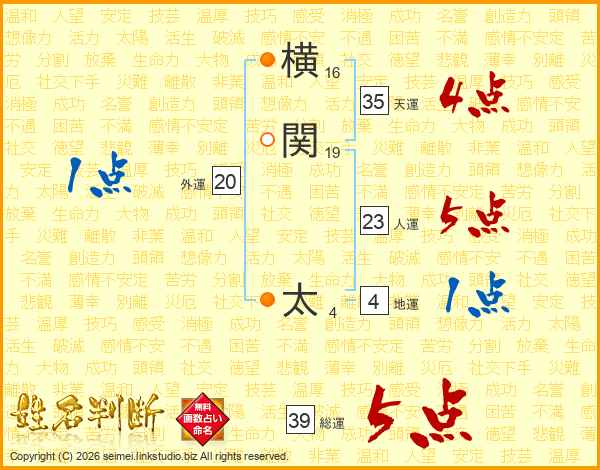 生活面を象徴する運勢です。外部から受ける影響力を表し、結婚運、家庭運や職場、環境への順応性を表します。総運から人運を引いた画数。姓や名が1文字の場合を除く。