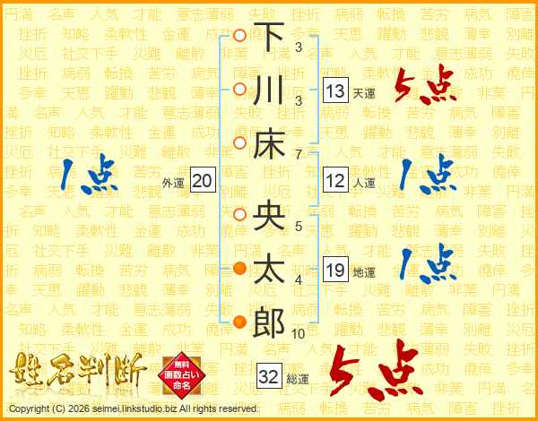下(3画)川(3画)床(7画) 央(5画)太(4画)郎(10画)