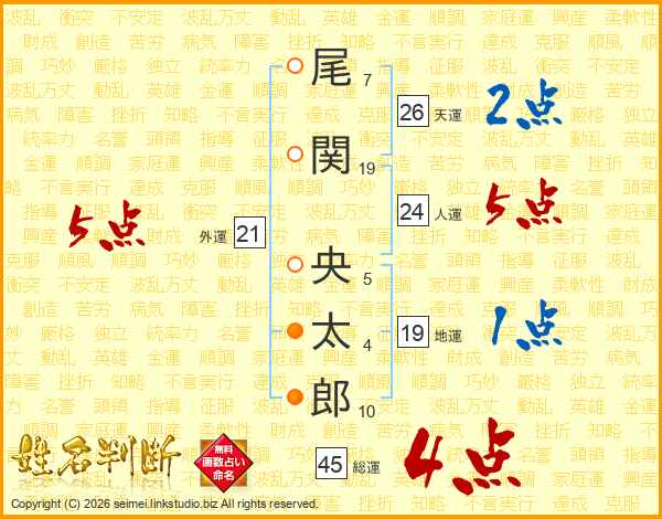 尾(7画)関(19画) 央(5画)太(4画)郎(10画)
