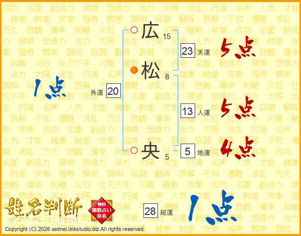 生活面を象徴する運勢です。外部から受ける影響力を表し、結婚運、家庭運や職場、環境への順応性を表します。総運から人運を引いた画数。姓や名が1文字の場合を除く。