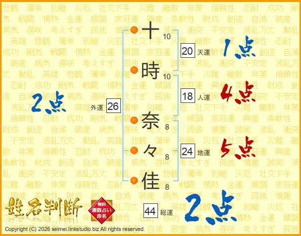 十(10画)時(10画) 奈(8画)々(8画)佳(8画)