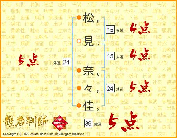松(8画)見(7画) 奈(8画)々(8画)佳(8画)