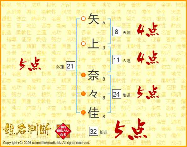矢(5画)上(3画) 奈(8画)々(8画)佳(8画)