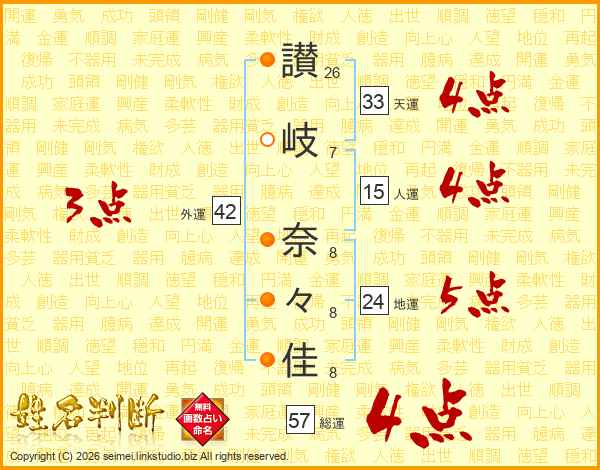 讃(26画)岐(7画) 奈(8画)々(8画)佳(8画)