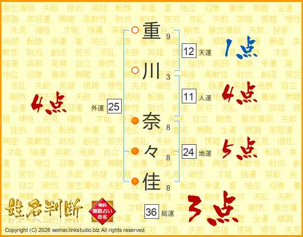 重(9画)川(3画) 奈(8画)々(8画)佳(8画)