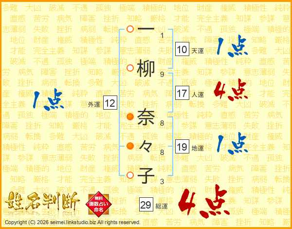 一(1画)柳(9画) 奈(8画)々(8画)子(3画)
