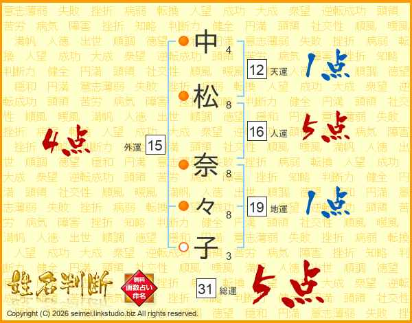 中(4画)松(8画) 奈(8画)々(8画)子(3画)