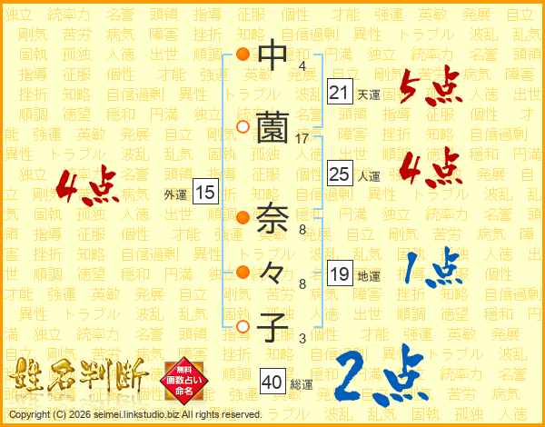 中(4画)薗(17画) 奈(8画)々(8画)子(3画)