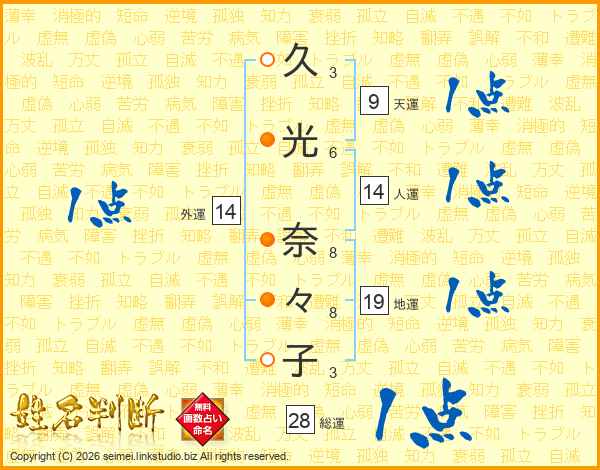 久(3画)光(6画) 奈(8画)々(8画)子(3画)