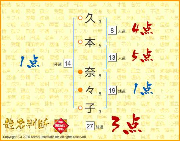 久(3画)本(5画) 奈(8画)々(8画)子(3画)