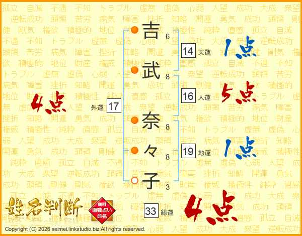 吉(6画)武(8画) 奈(8画)々(8画)子(3画)