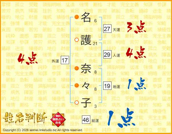 名(6画)護(21画) 奈(8画)々(8画)子(3画)