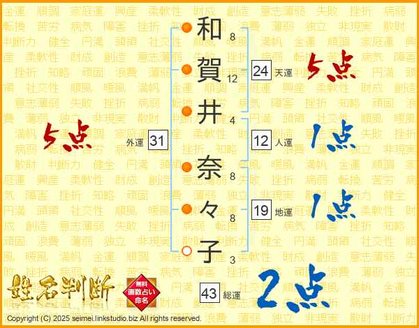 和(8画)賀(12画)井(4画) 奈(8画)々(8画)子(3画)