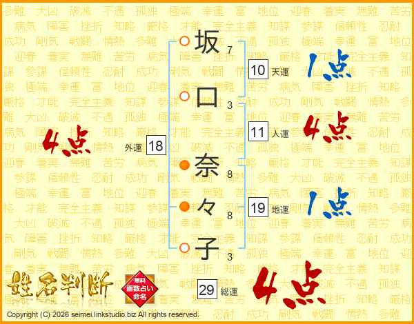 坂(7画)口(3画) 奈(8画)々(8画)子(3画)