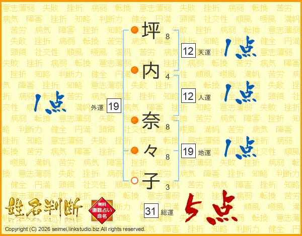 坪(8画)内(4画) 奈(8画)々(8画)子(3画)