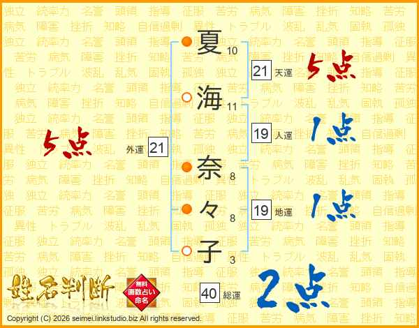 夏(10画)海(11画) 奈(8画)々(8画)子(3画)
