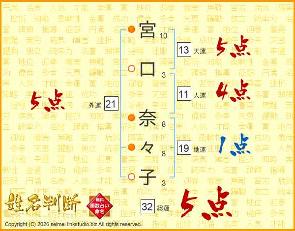 宮口奈々子さんの総運は32画の5点!
