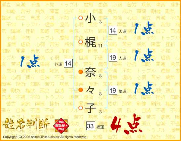 小(3画)梶(11画) 奈(8画)々(8画)子(3画)