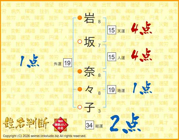 岩(8画)坂(7画) 奈(8画)々(8画)子(3画)