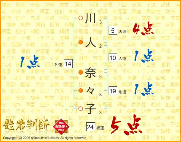 川(3画)人(2画) 奈(8画)々(8画)子(3画)