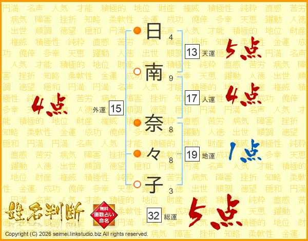 日(4画)南(9画) 奈(8画)々(8画)子(3画)
